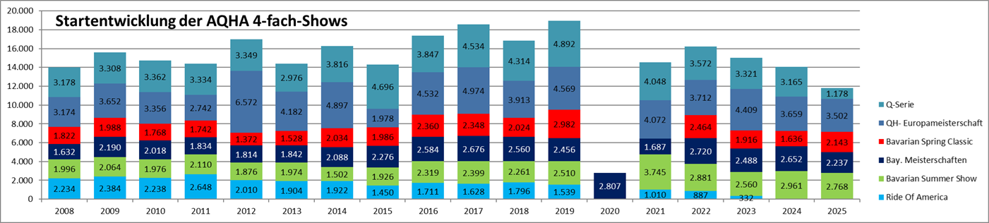 in der Nettobetrachtung (ohne AQHA-Mehrfachshows) als "echte" Starts sind es nur noch 4.520 AQHA-Starts bundesweit in der Turniersaison 2025.