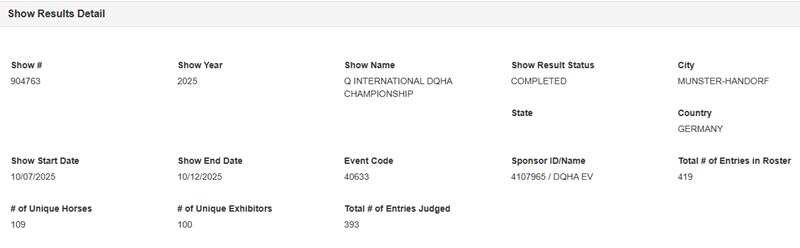 Im Mehrjahresvergleich zeigt die Q25 damit einen Rückgang an AQHA-Starts pro Show um 68%, im Vergleich mit anderen AQHA-Turnieren in diesem Jahr rutscht die DQHA Q25 von Rang 2 auf Rang 8 der europäischen AQHA-Turniere. Während die Q24 in Aachen noch das zweitgrößte AQHA-Turnier nach der FEQHA-Europameisterschaft war, ist in diesem Jahr u.a. die Belgische Quarter Horse-Meisterschaft mit 444 AQHA-Starts größer als die DQHA Q25 in Münster.